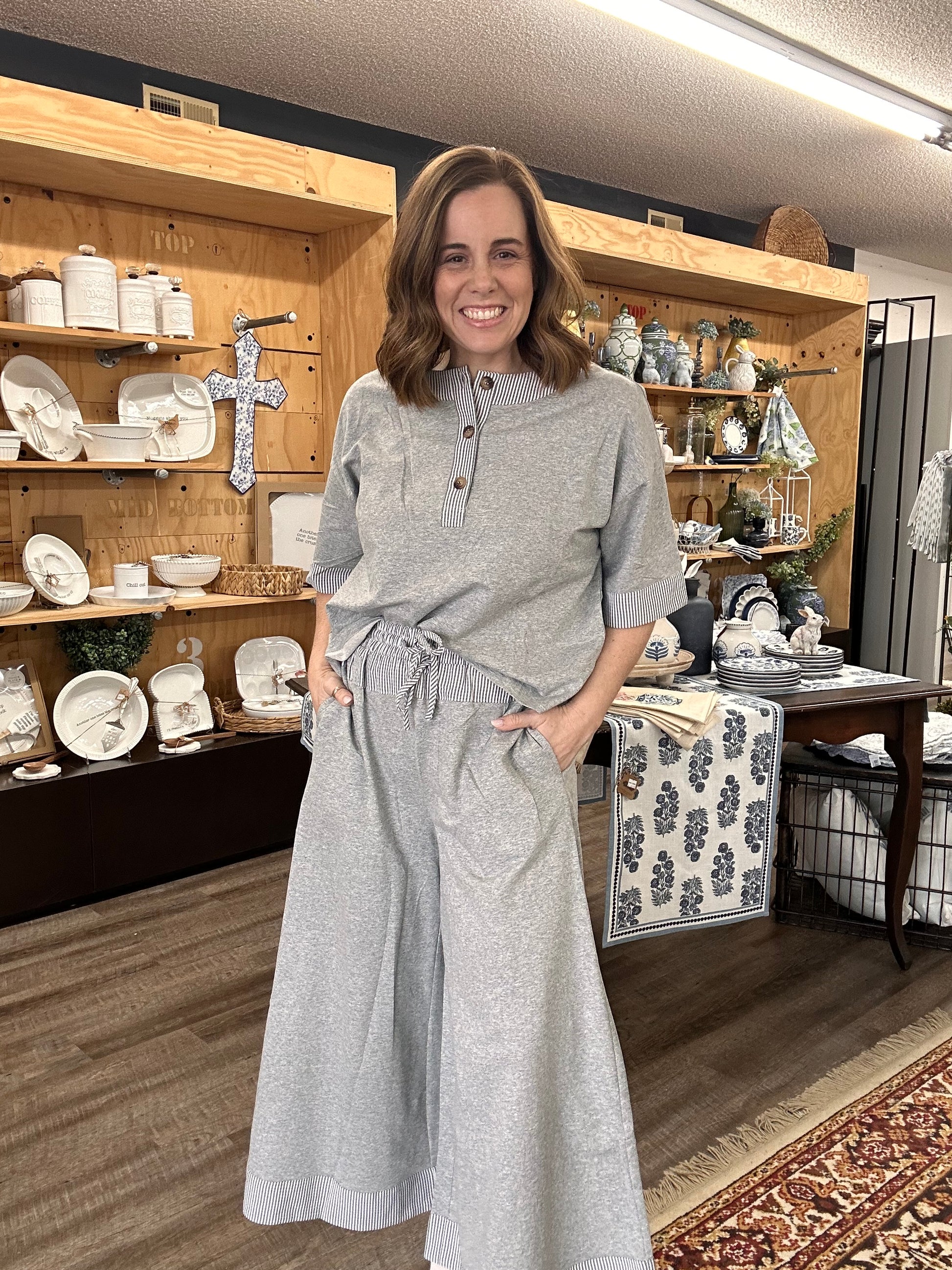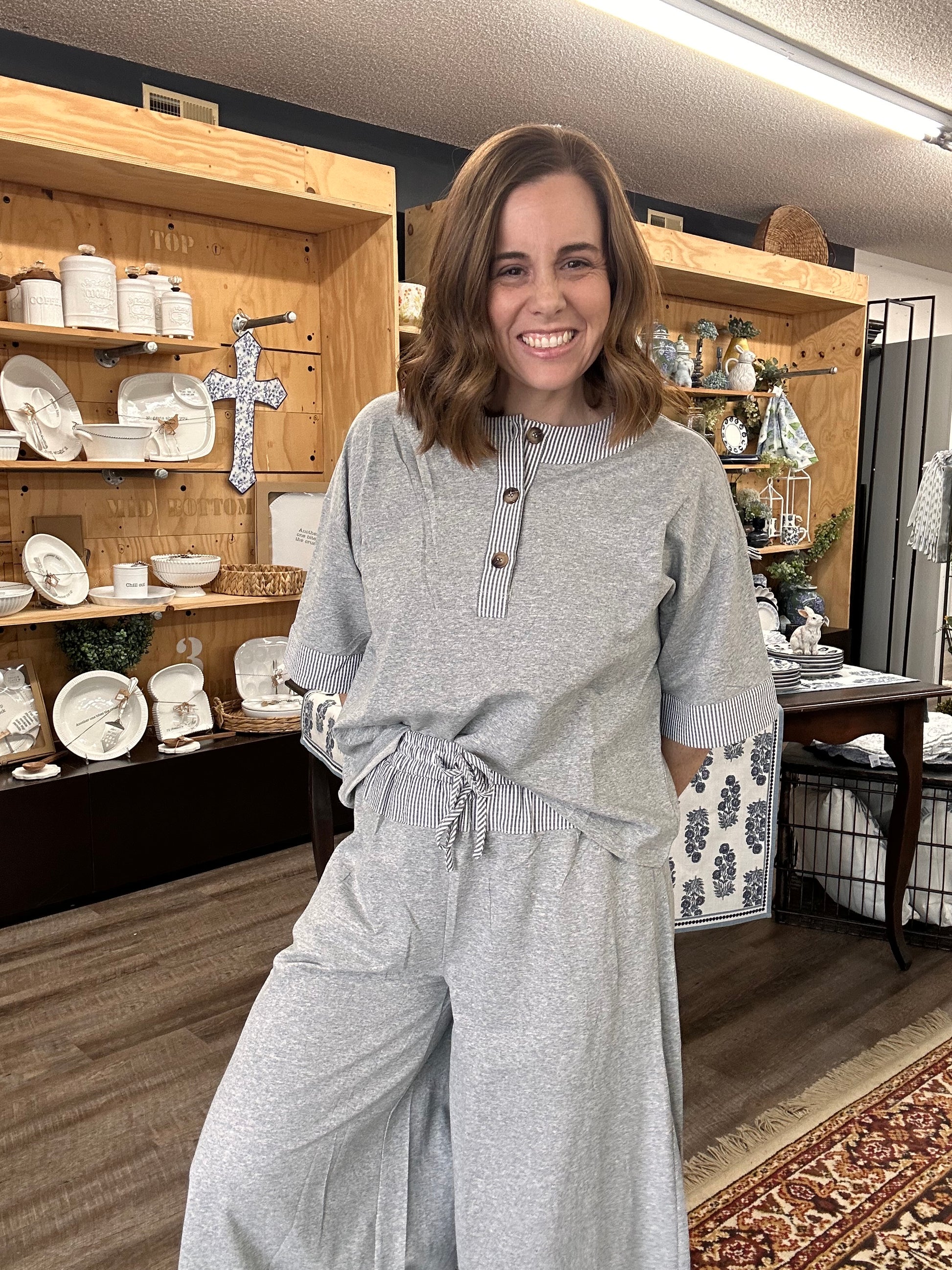Who doesn’t love a good set to throw on in the morning and not have to think about an outfit? We do! This set is lightweight and the heather grey with the white and grey details are so cute and add a feminine touch to the set.