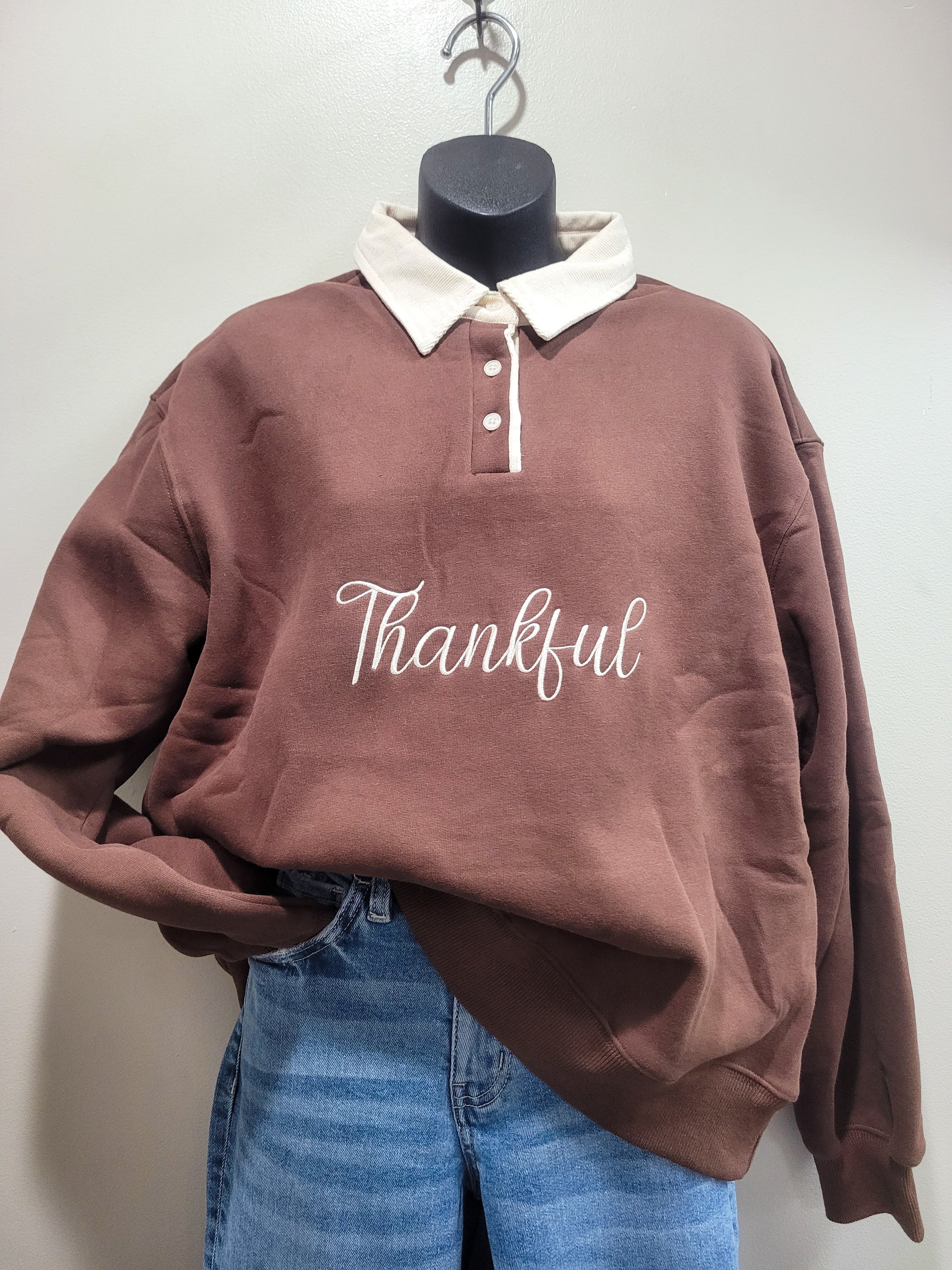 This 1/4 button fly sweatshirt would be perfect for anyone’s fall closet, but also for a Thanksgiving outfit. With the cream corduroy collar and embroidered Thankful, this is a must have.