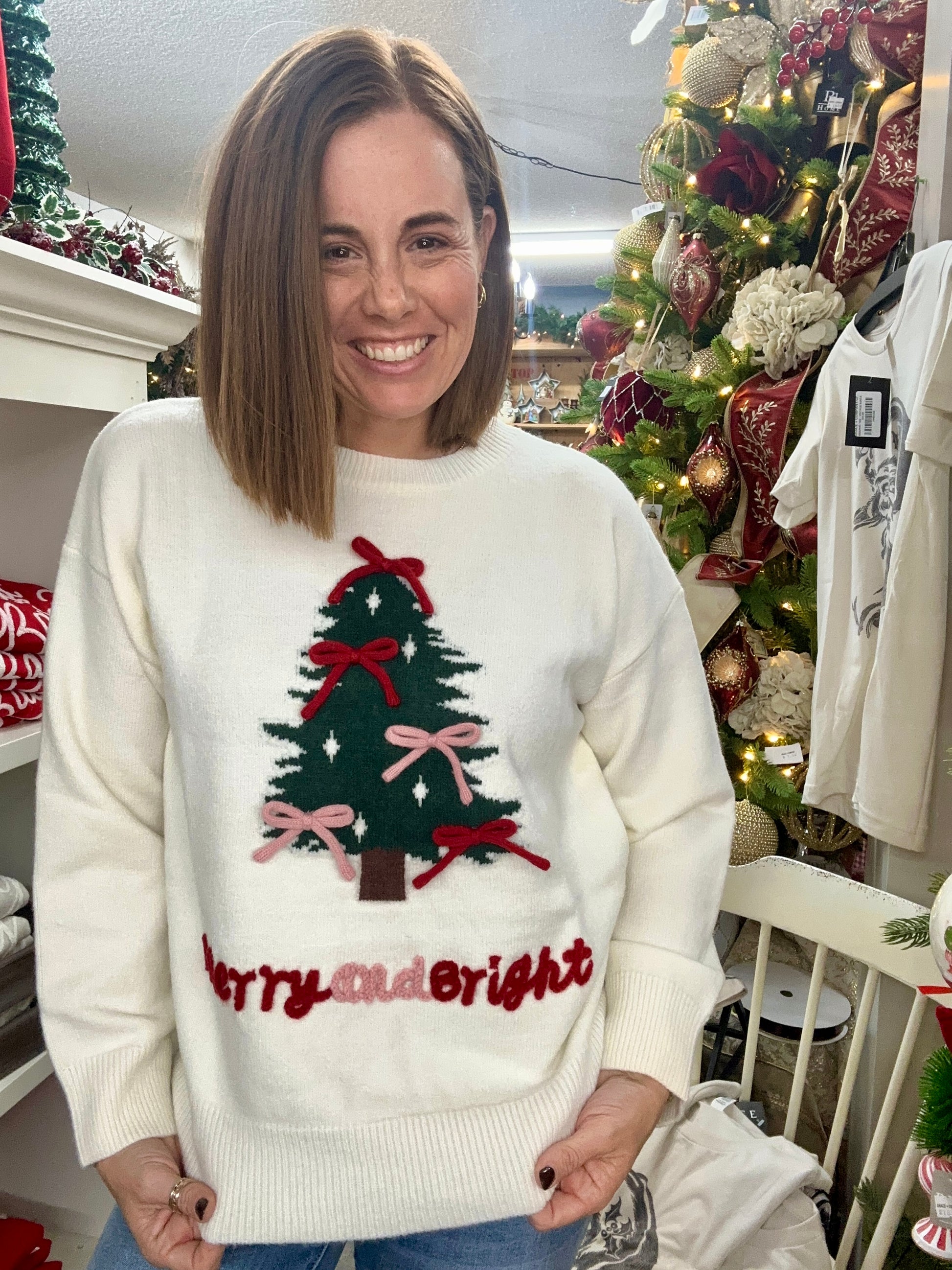 Merry and Bright—the Christmas tree adorned sweater has 3D pink and red knit bows adding a touch of sweet fun to this sweater!