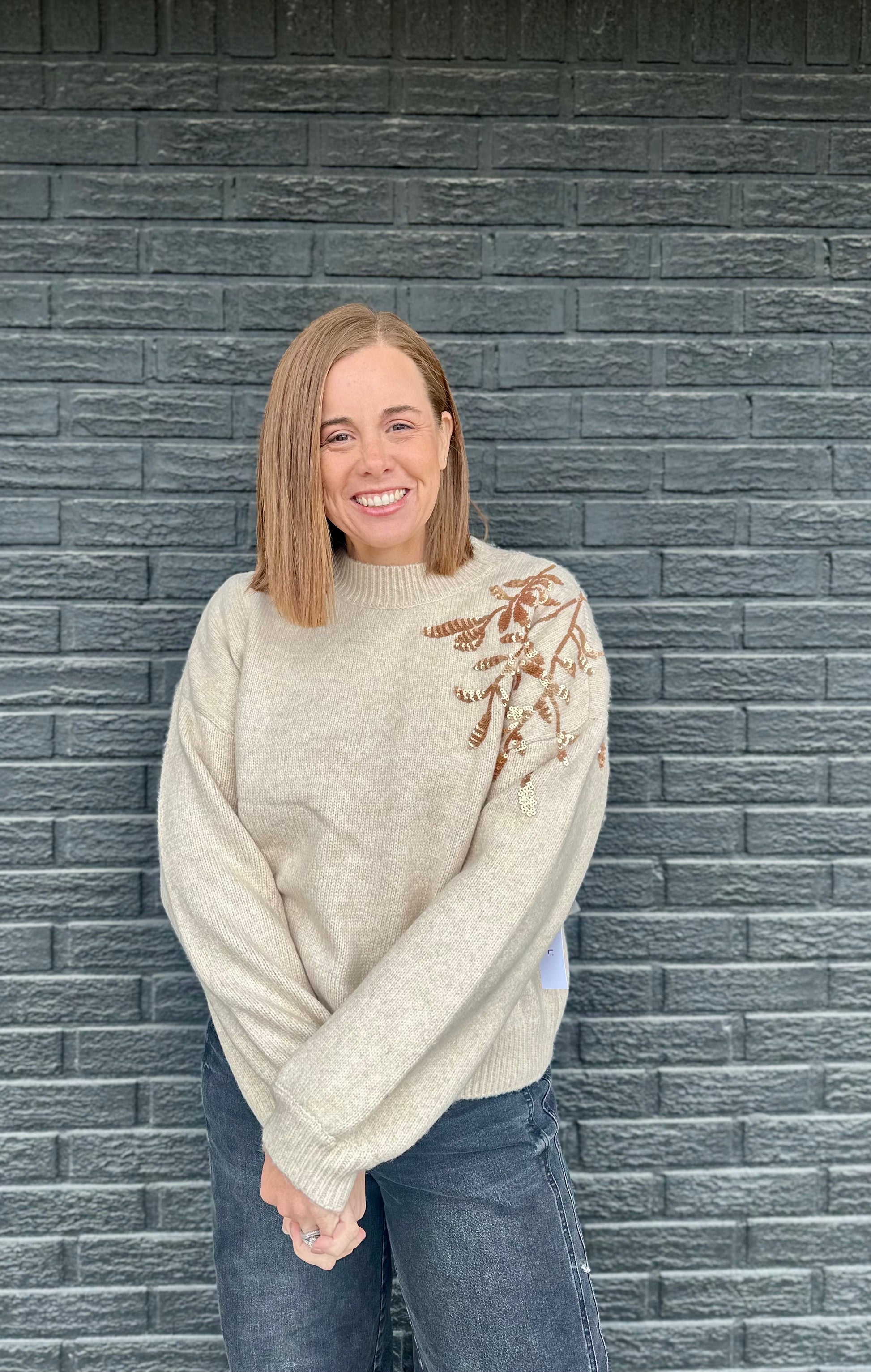 Cozy with a hint of glam! This soft neutral sweater shines with a gold leaf sequin accent on one shoulder, making it the perfect mix of comfort and sparkle.