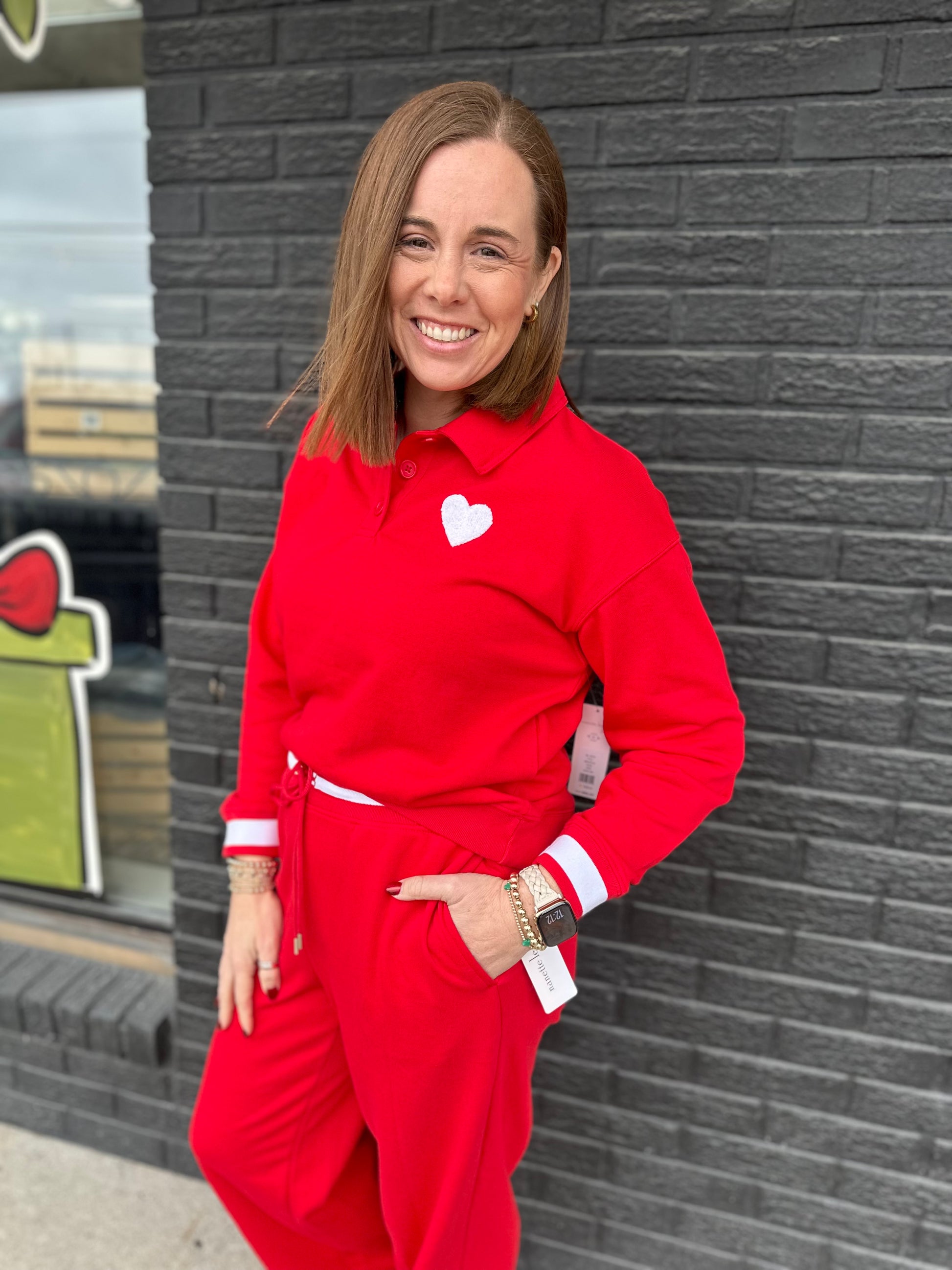 This red long sleeve polo features a sweet white heart embroidery, adding a flirty, Valentine ready touch to a classic favorite.