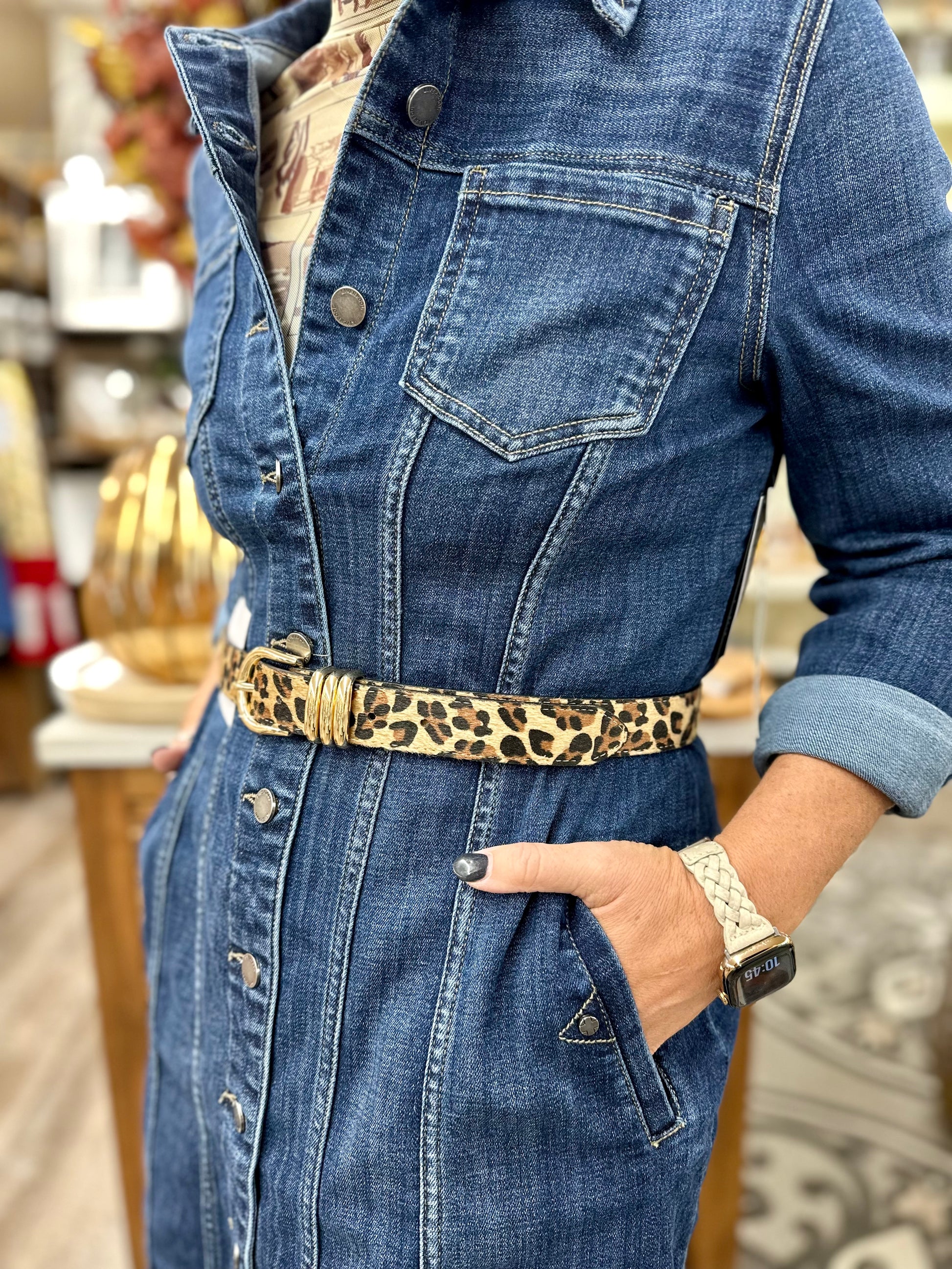 This long jean dress can be worn as it is here or as a long duster/jacket with all the buttons open.