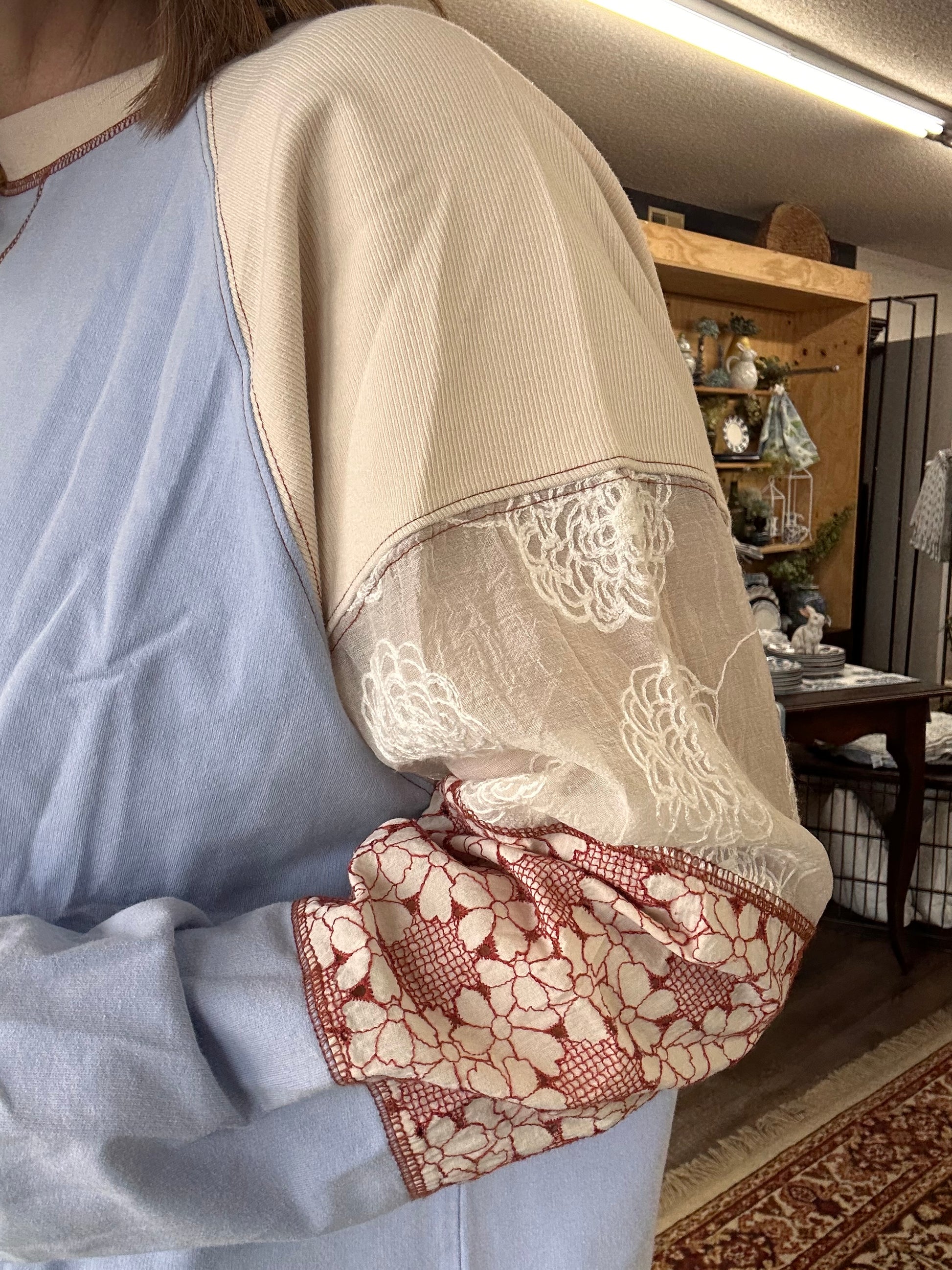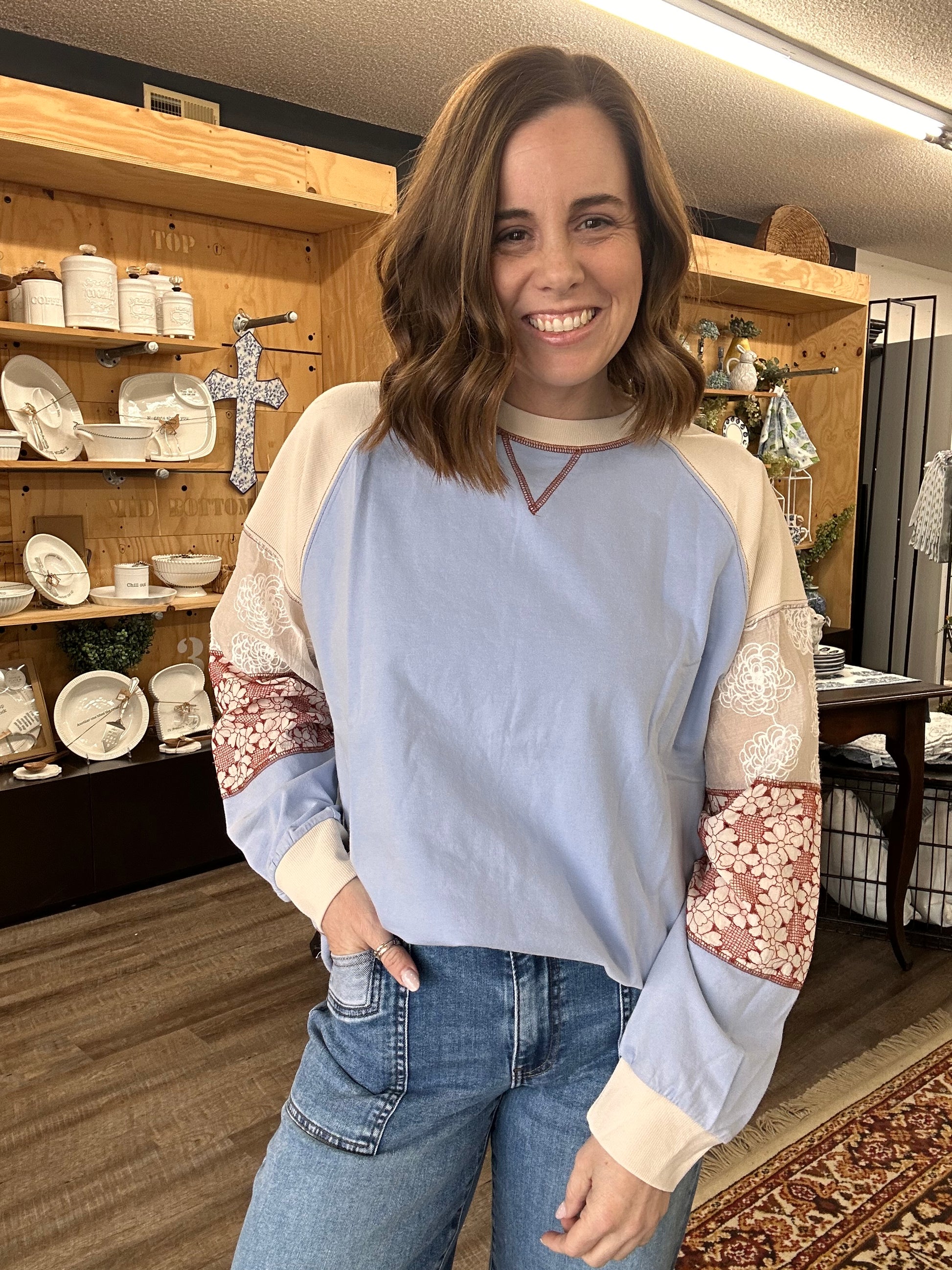 The perfect transition top. This crewneck top has the cutest lace and patch detail sleeve; perfect to throw on with a pair of jeans and tennis shoes.