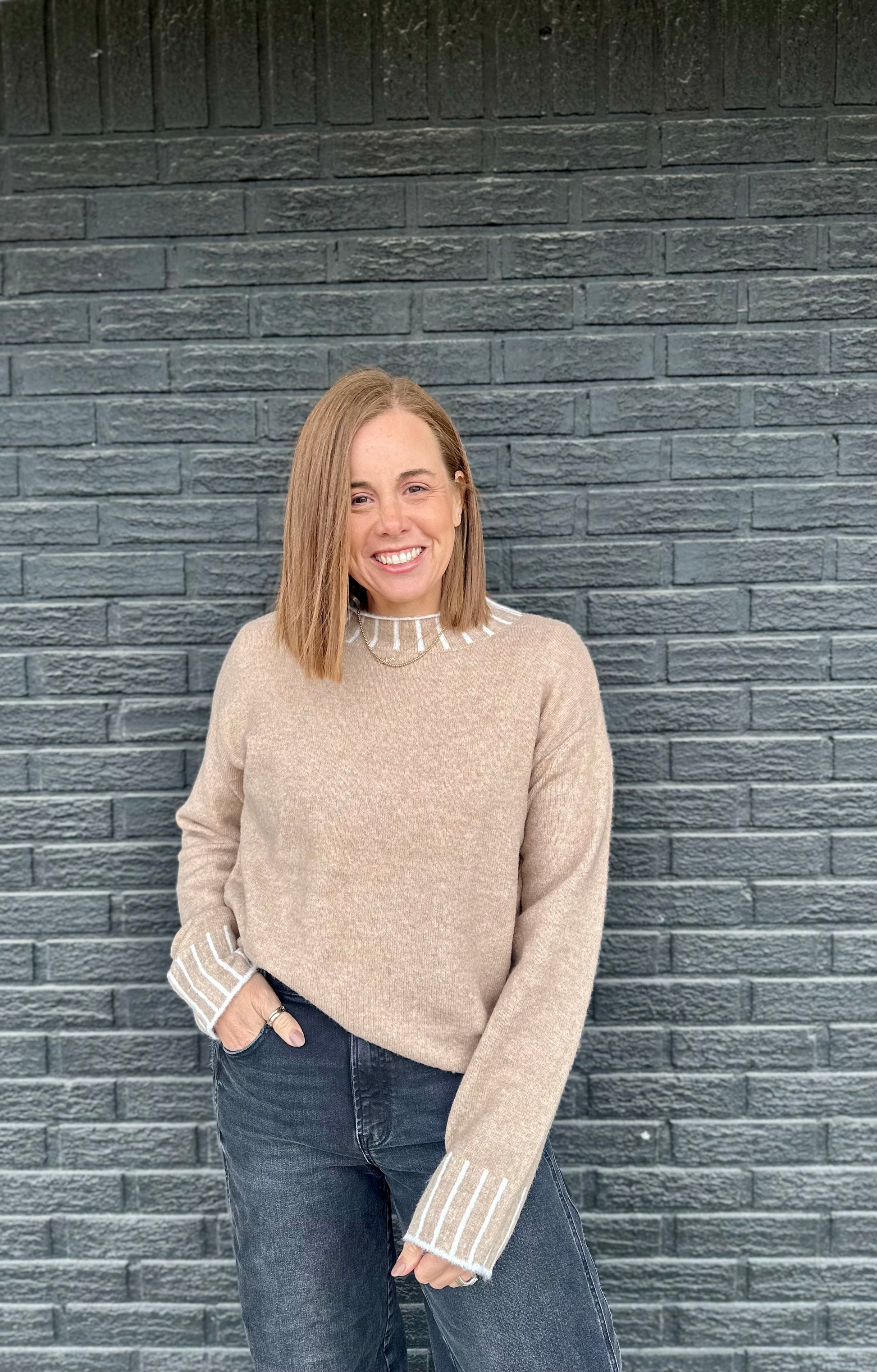 This taupe mock neck sweater with white blanket stitching is the perfect mix of simple and stunning!