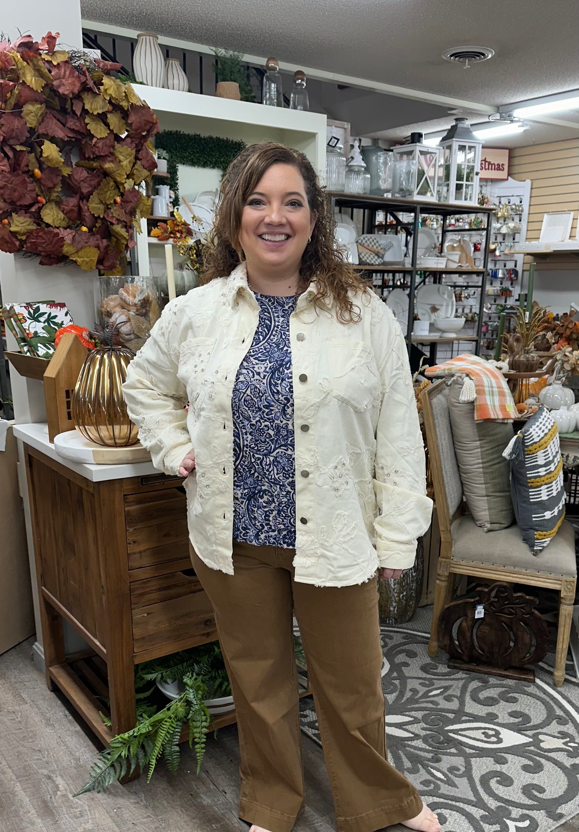 This cream shacket is adorned with an appliqué that gives a vine and leaf look with rhinestones.