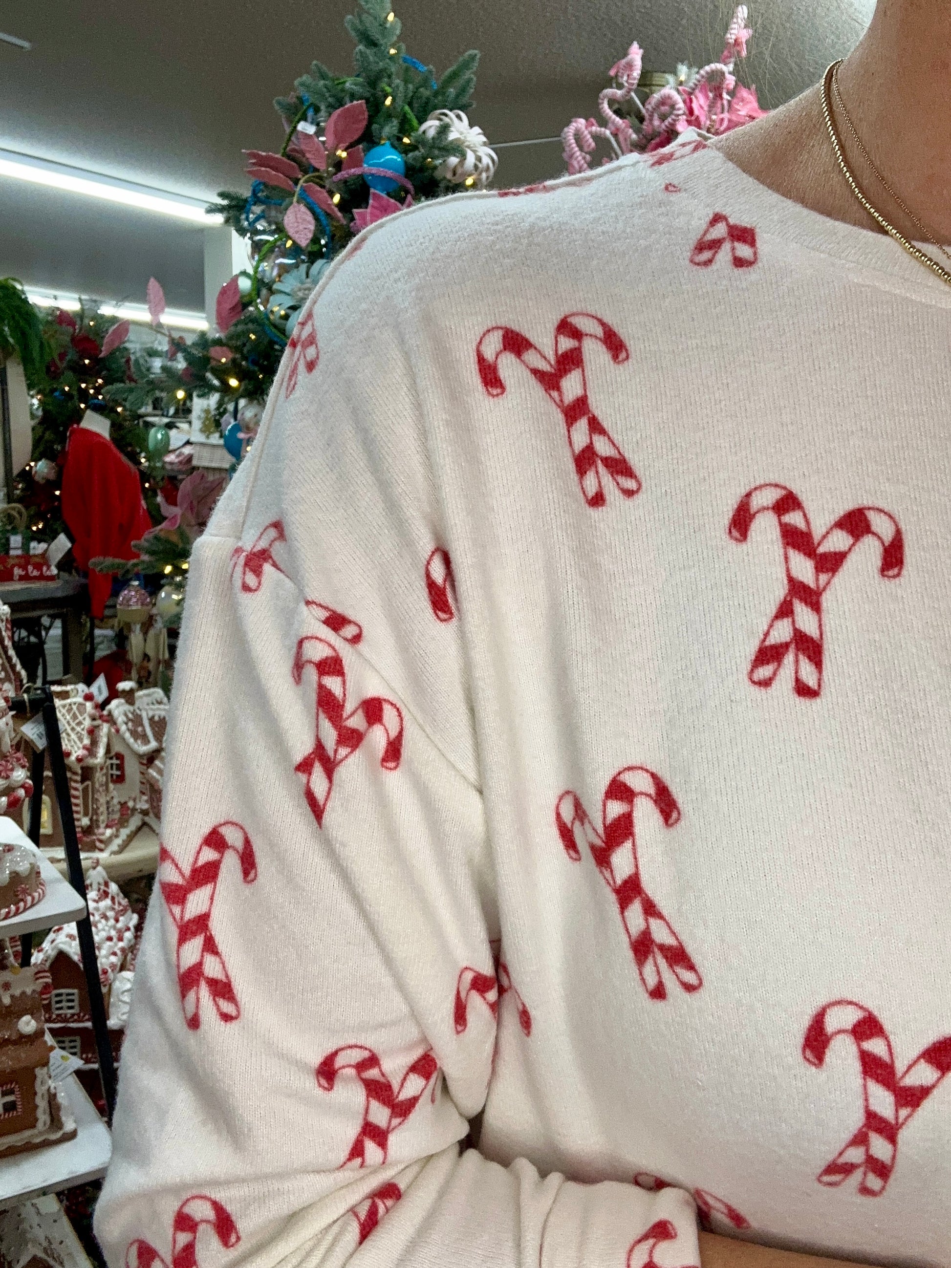 A comfy long sleeve crew neck and matching drawstring bottoms, this candy cane set is fleece! This is perfect as a pajama set or lounge wear too!