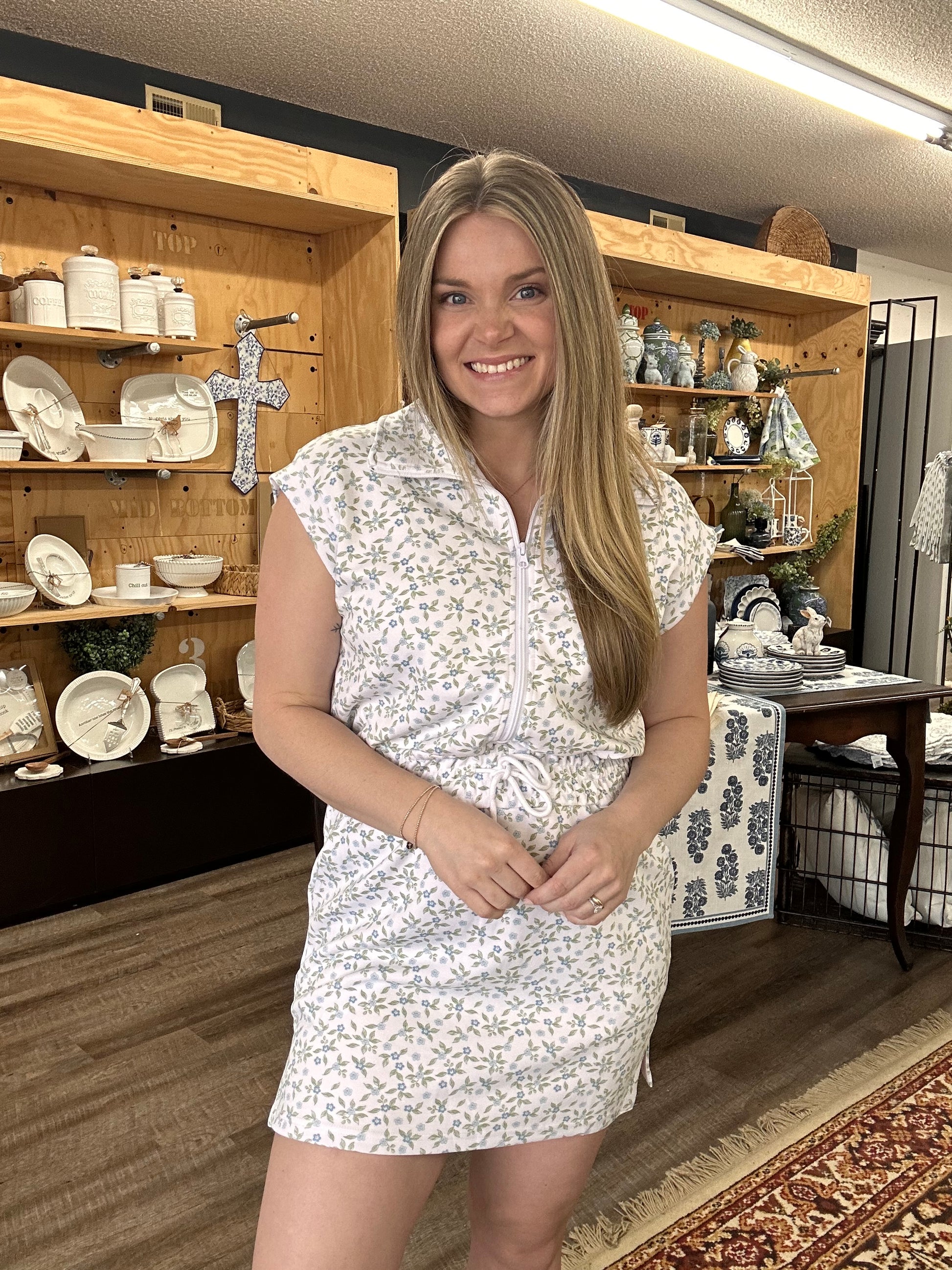 This dress will perfect this Spring with a pair of white tennis shoes. It features a drawstring waist and a half zip top.