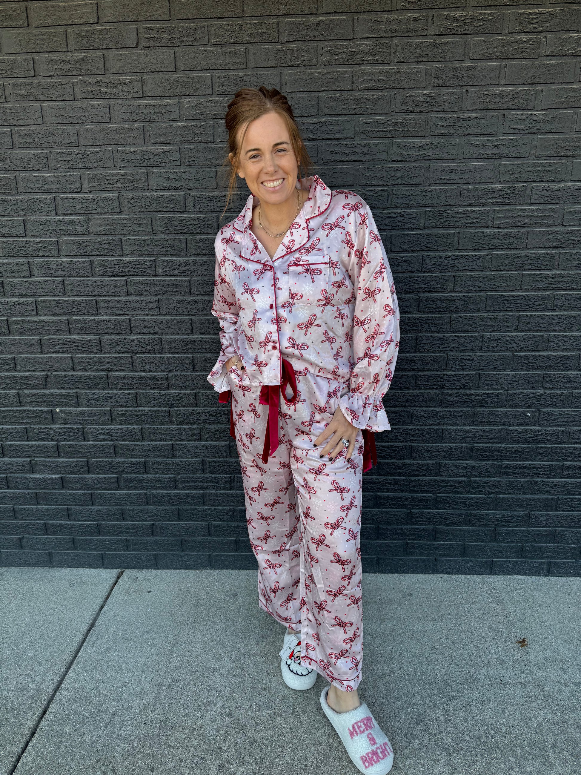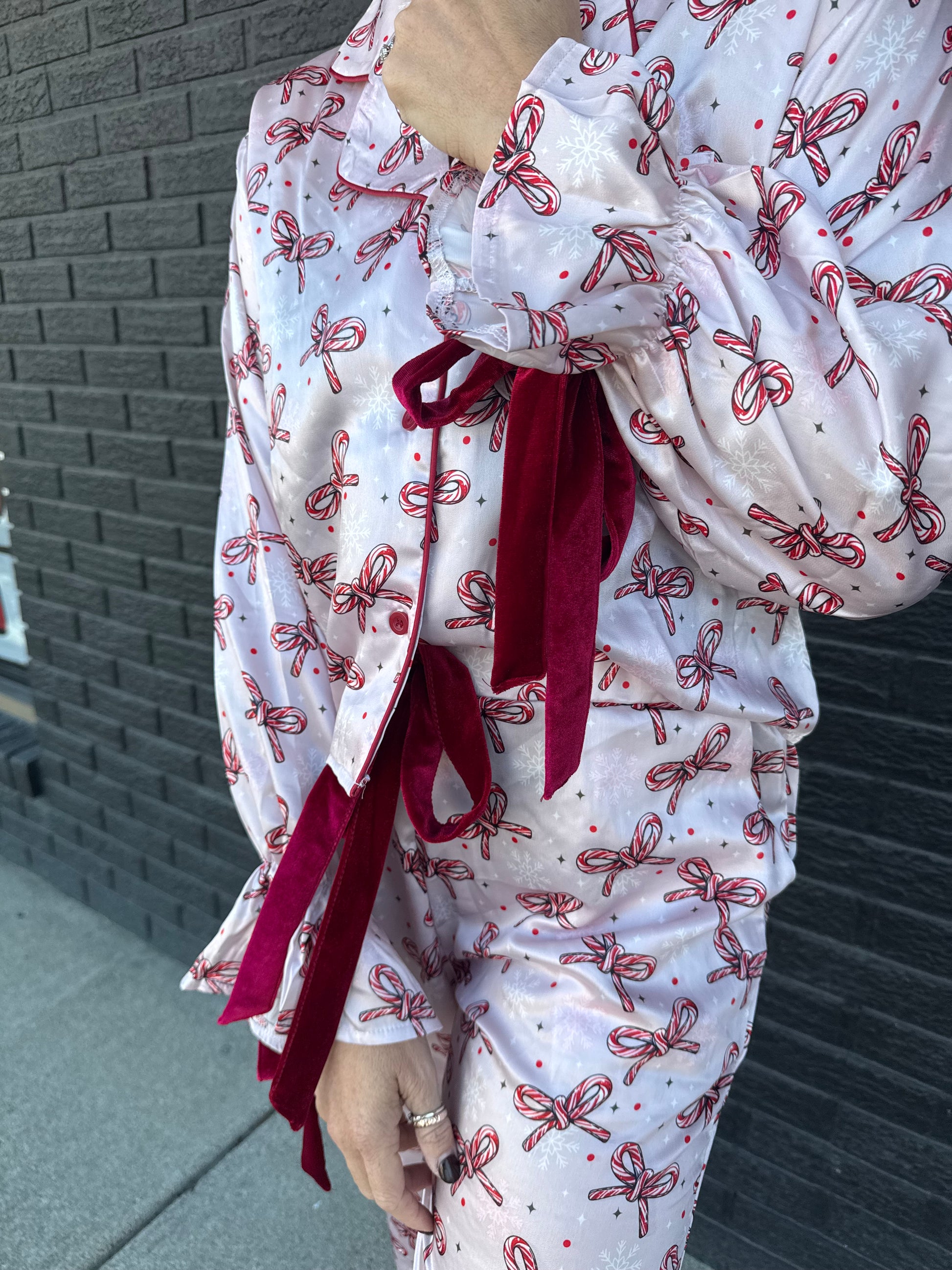 This satin pj set is so CUTE with the candy cane bows! The button up top is cropped, there are velvet bows on the ends of the sleeves and the waistband of the bottoms, giving all the vibes!