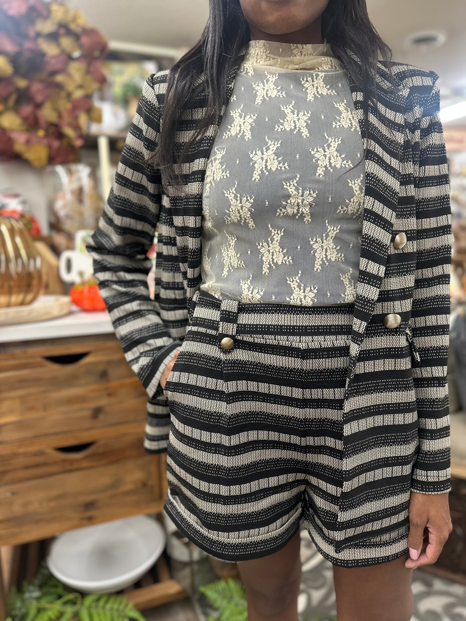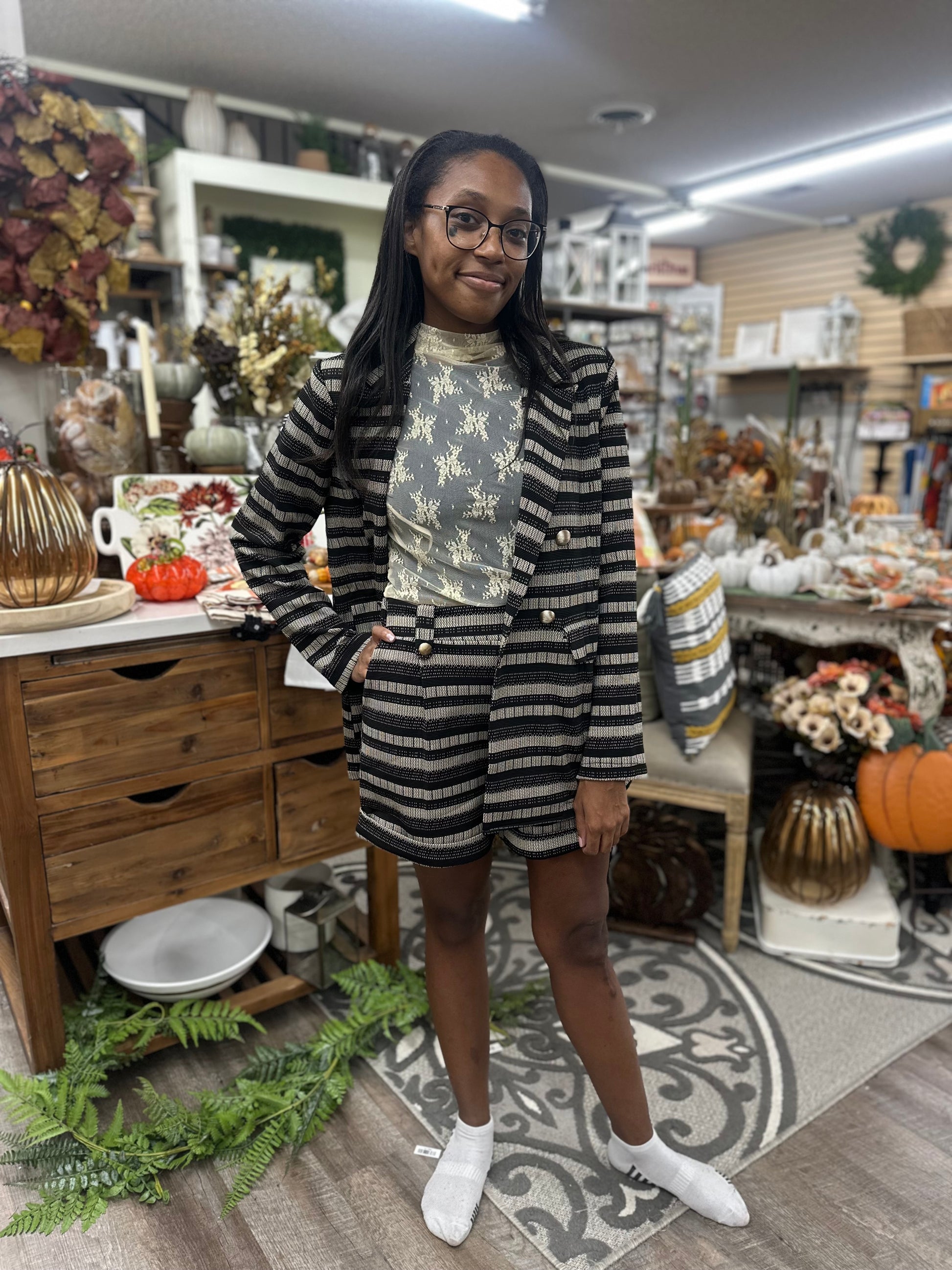 These dress shorts paired with their matching blazer makes a classy look and they feature pockets and textured gold buttons.