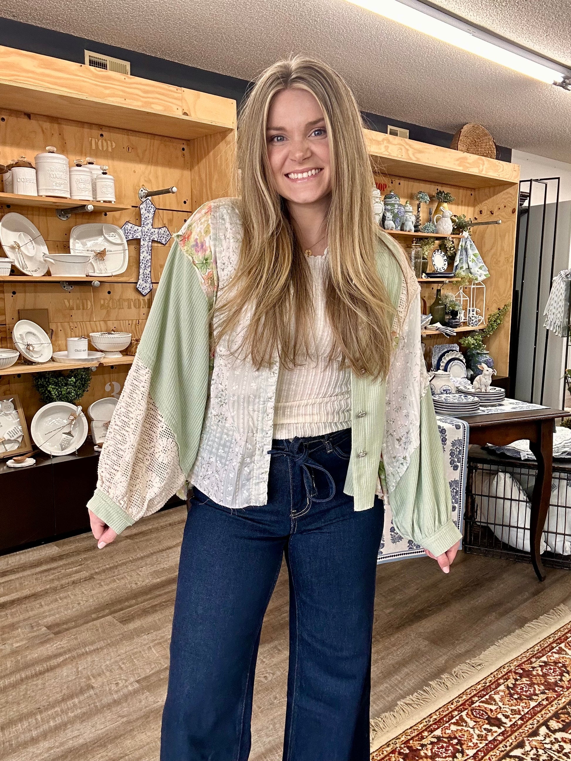 This adorable button up top has cute different fabrics all sewn together and this is the perfect to throw on over a little tank or tee. This could also be so cute for Easter this year!